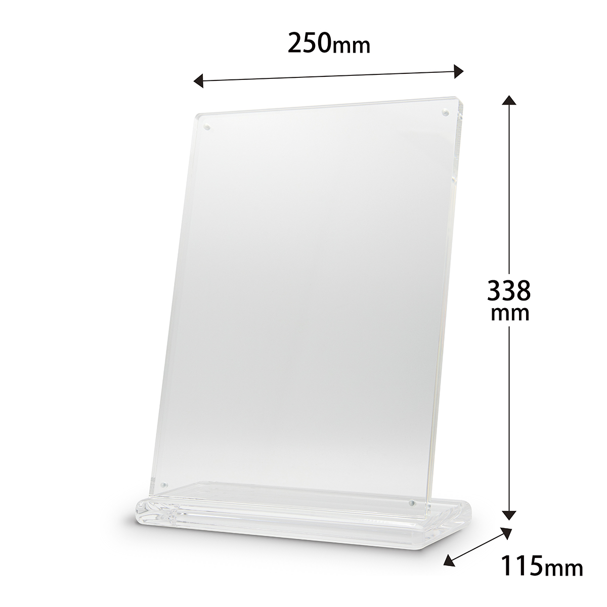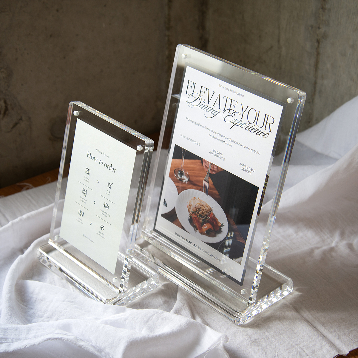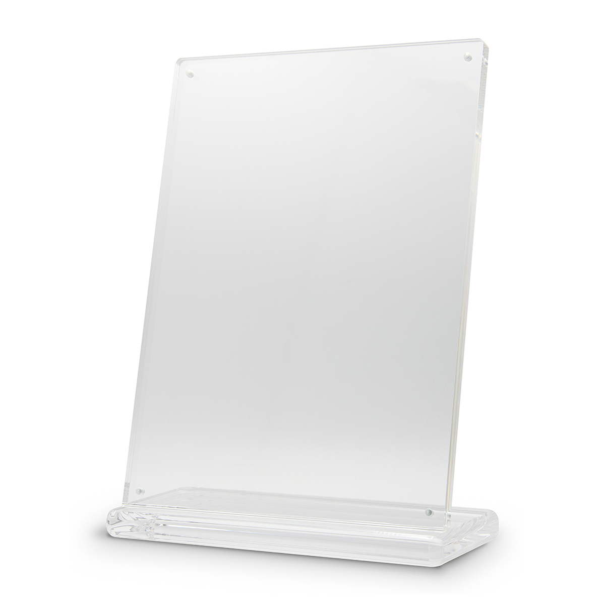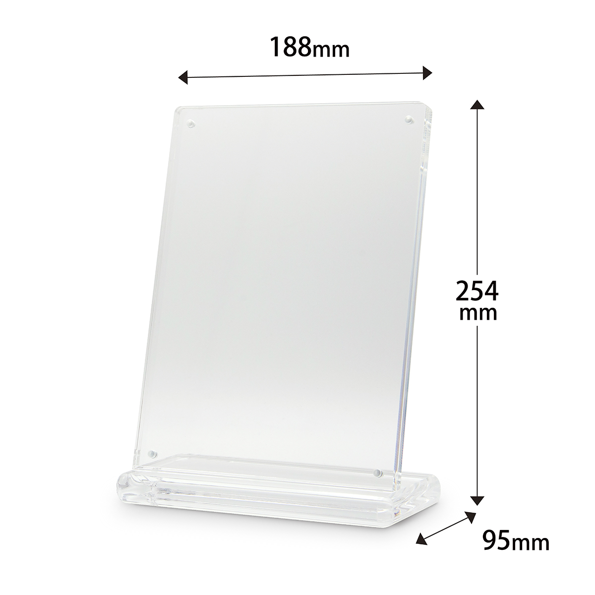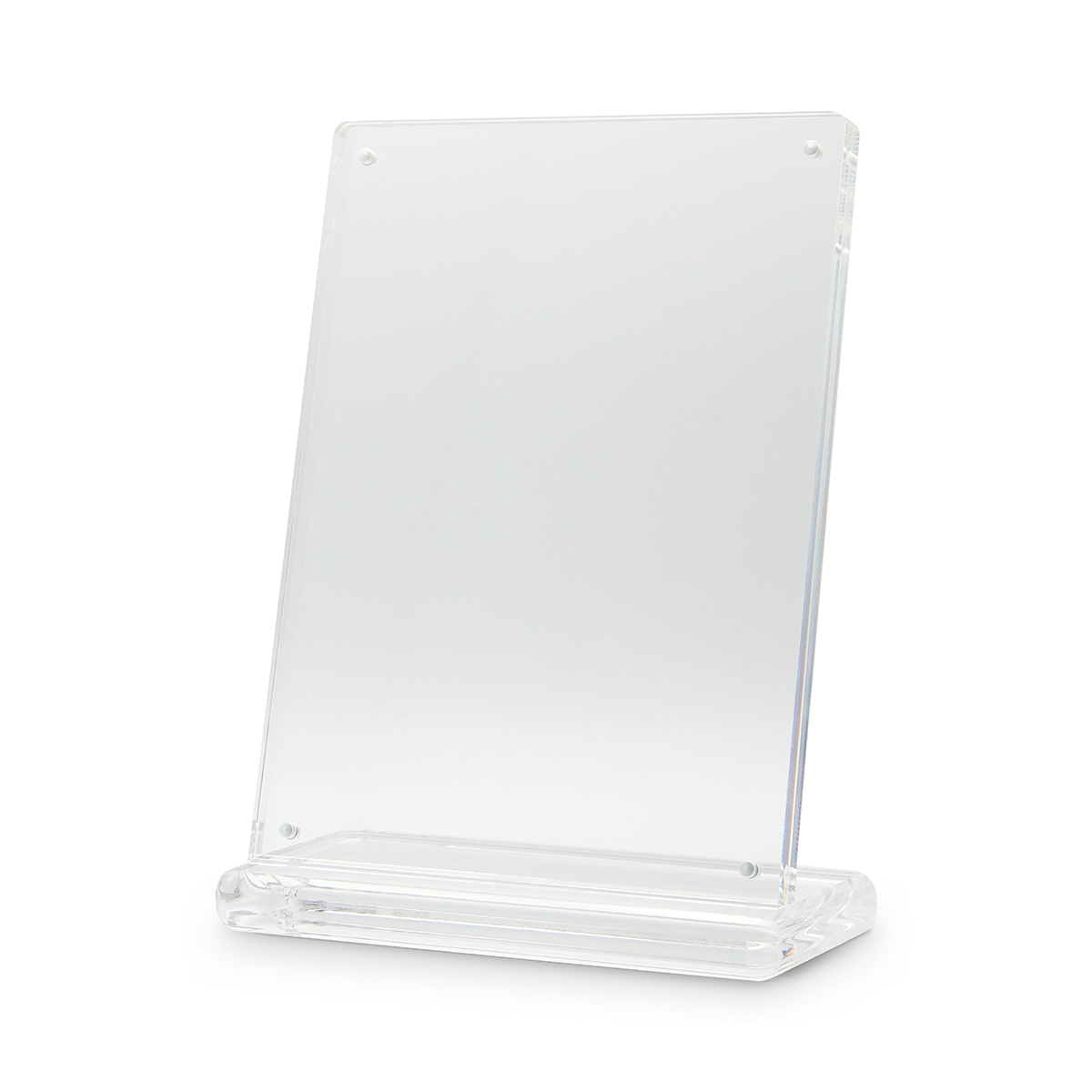 店舗や展示会、オフィス空間に自然となじみながら、情報を美しく引き立てるL型アクリルスタンド。
