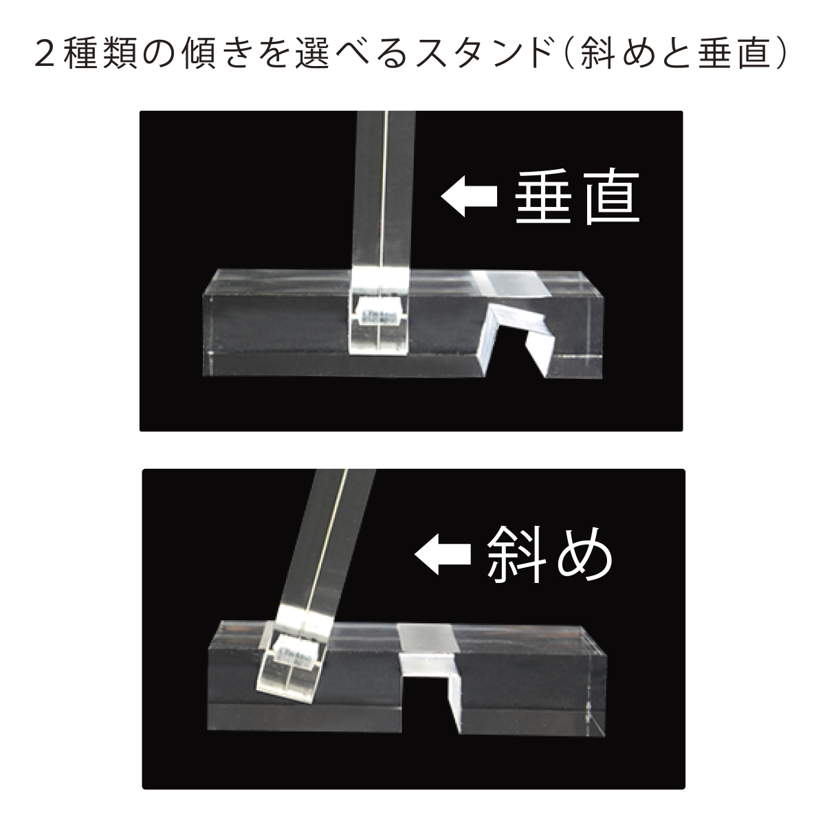 立てかける角度は、垂直と斜めの2通り。展示スペースや掲示内容に応じて、最適な見せ方を選べます。