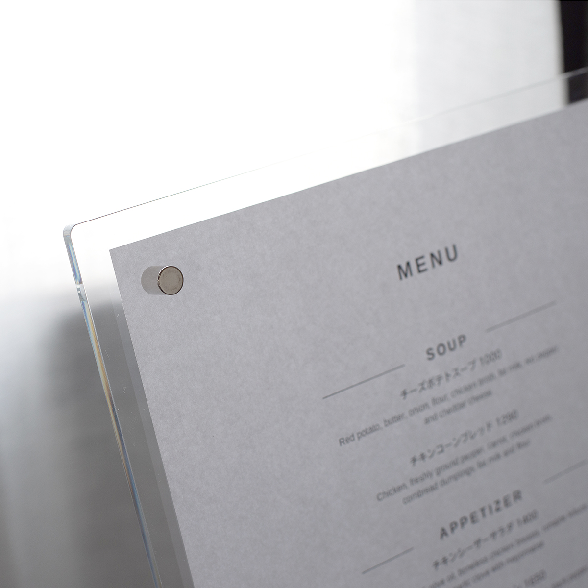 付属のアクリル板はマグネット固定式でメニューや案内の差し替えが簡単。